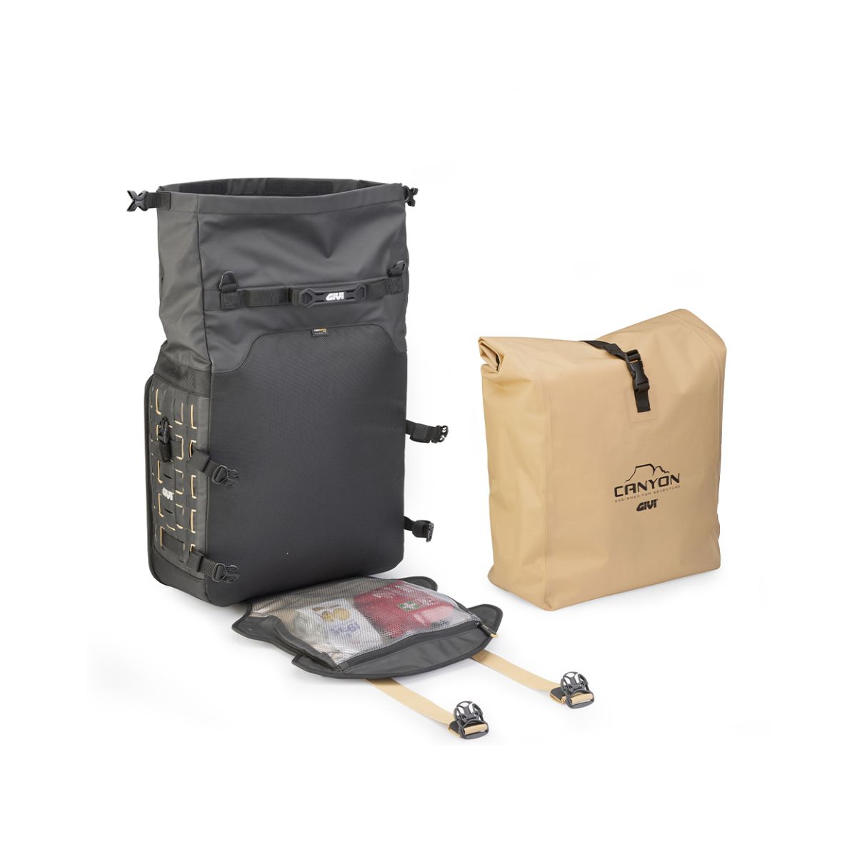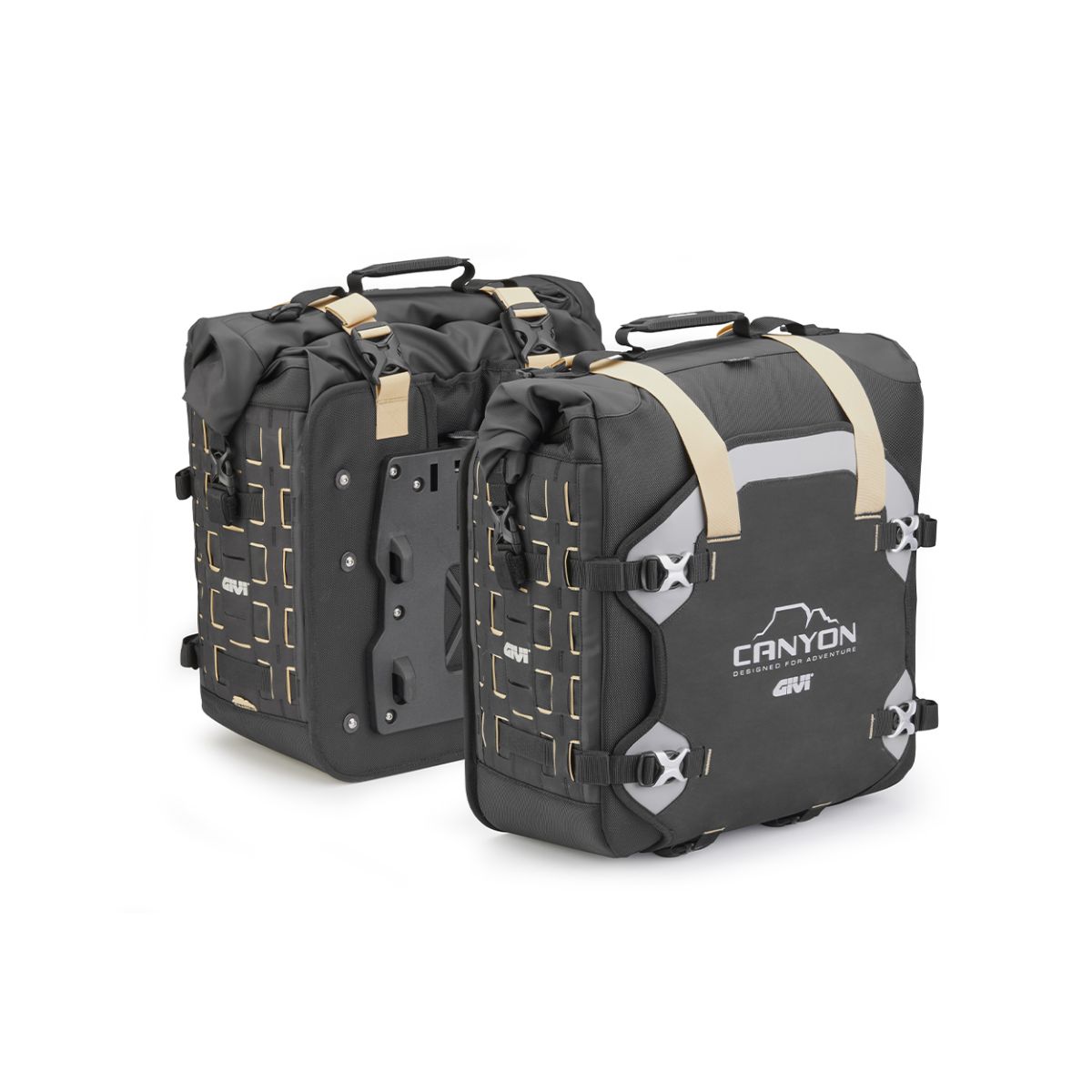 Alforjas dotadas de parrilla en nailon para la fijación al portamaletas lateral tipo PL_ _ _, PLR_ _ _, PL_CAM, PLR_CAM, PLO_ _ _MK, PLOR_ _ _MK, PLO_ _ _N (+OFMK), PLOR_ _ _N (+OFMK) y algunos tipos de soportes originales.