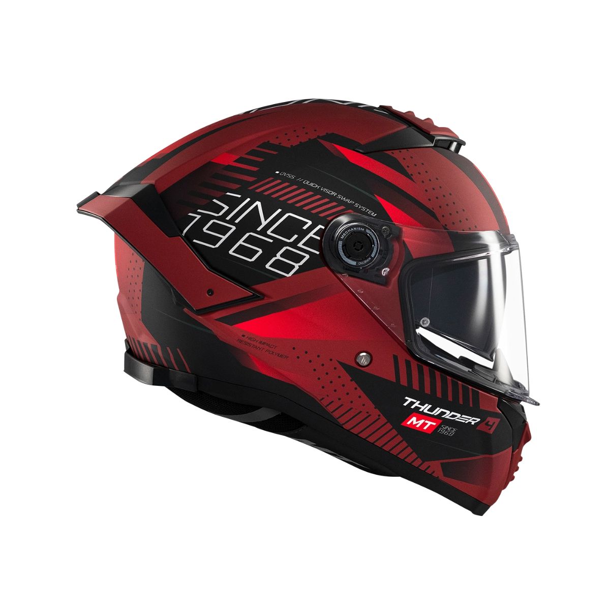 El MT Thunder 4 SV es un casco integral diseñado para ofrecer máxima protección, comodidad y tecnología en cada trayecto. Su calota de HIRP (polímeros de alta resistencia) brinda una protección confiable, mientras que la visera solar retráctil y el sistema MT-QVSS garantizan practicidad y seguridad.