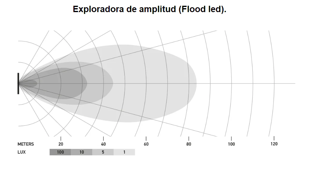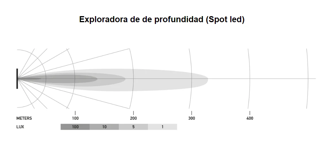 - Y la otra exploradora de amplitud (Flood led), intensidad luminosa (Candela: Cd) : 85 mts (profundidad) x 30 mts (amplitud)