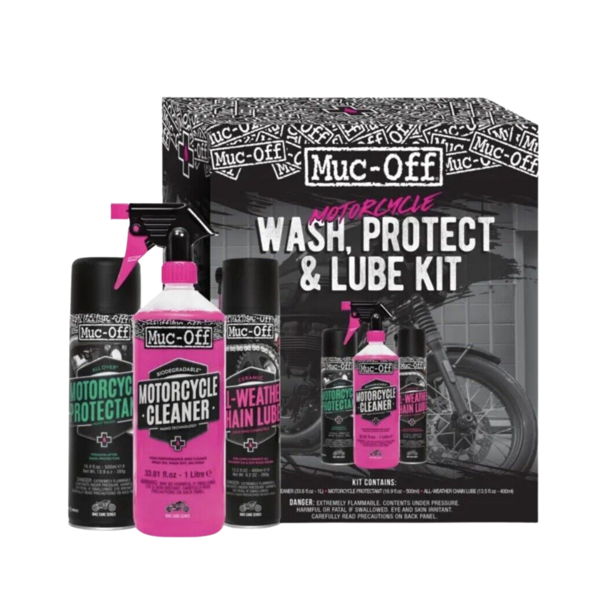 Mantén tu moto impecable y protegida con el Kit de Cuidado Muc-Off, que combina limpieza, protección y lubricación en un solo paquete.