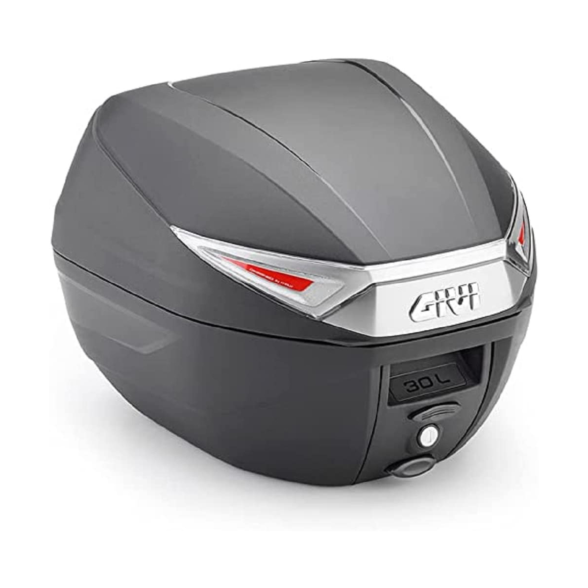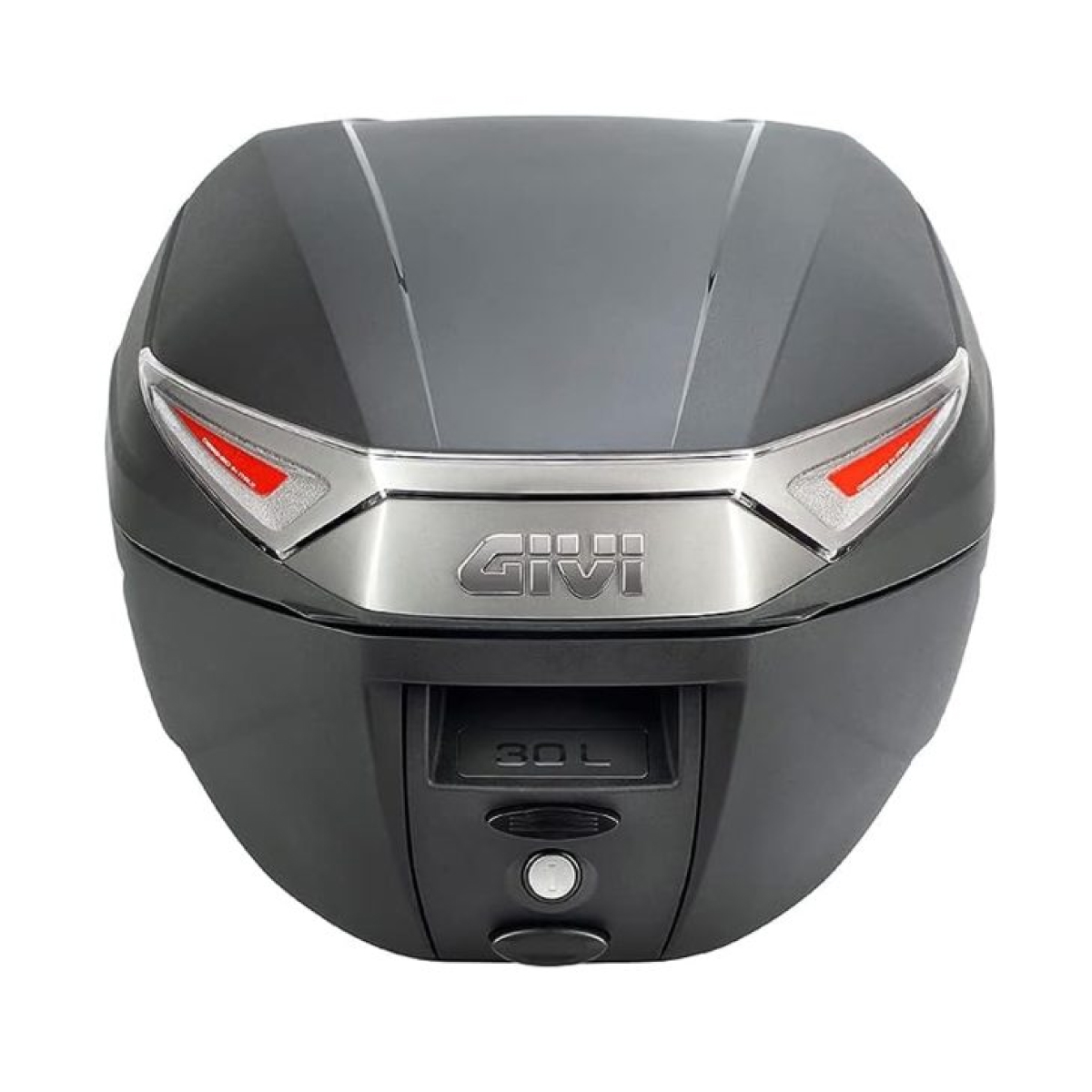 Baúl Givi MONOLOCK® de 30L en color negro con catadióptricos gris.